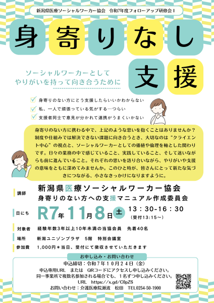 11月8日(土)に開催されるフォローアップ研修会Ⅰの案内になります。テーマは「身寄りなし支援」です。お申込みは添付ファイルをご確認ください。